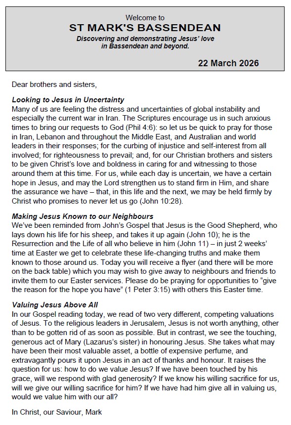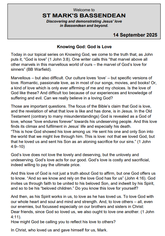 Discovering and demonstrating Jesus' love in Bassendean and beyond.